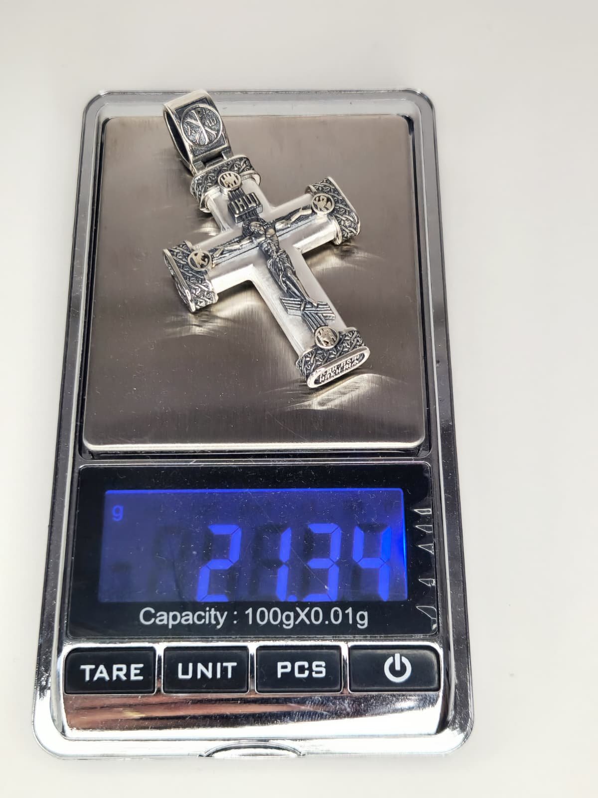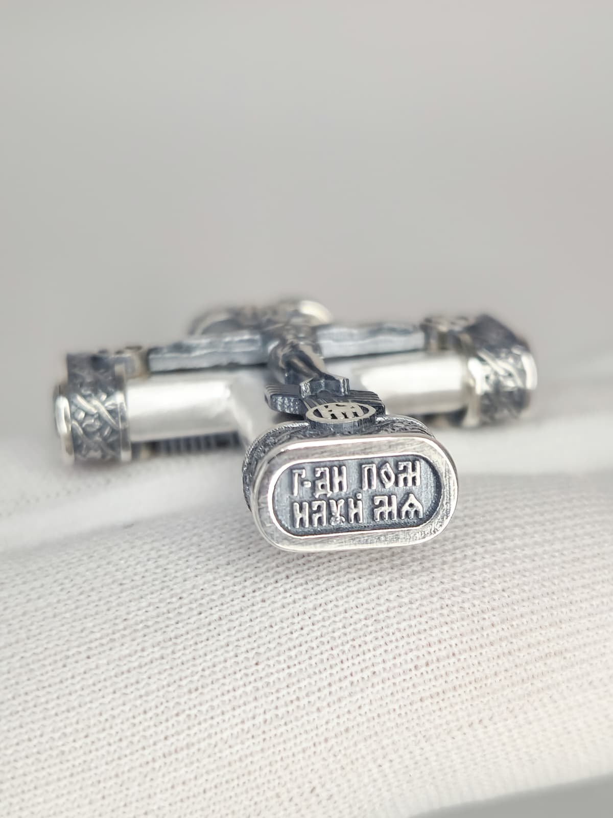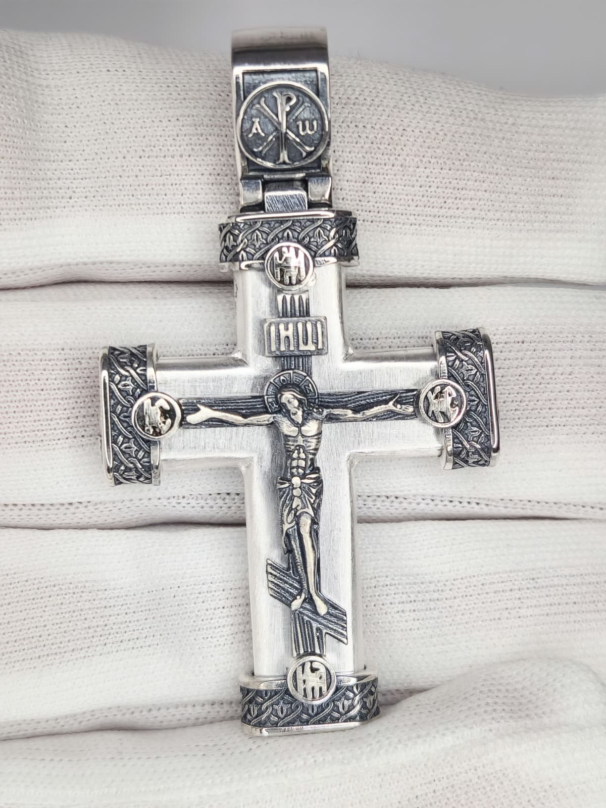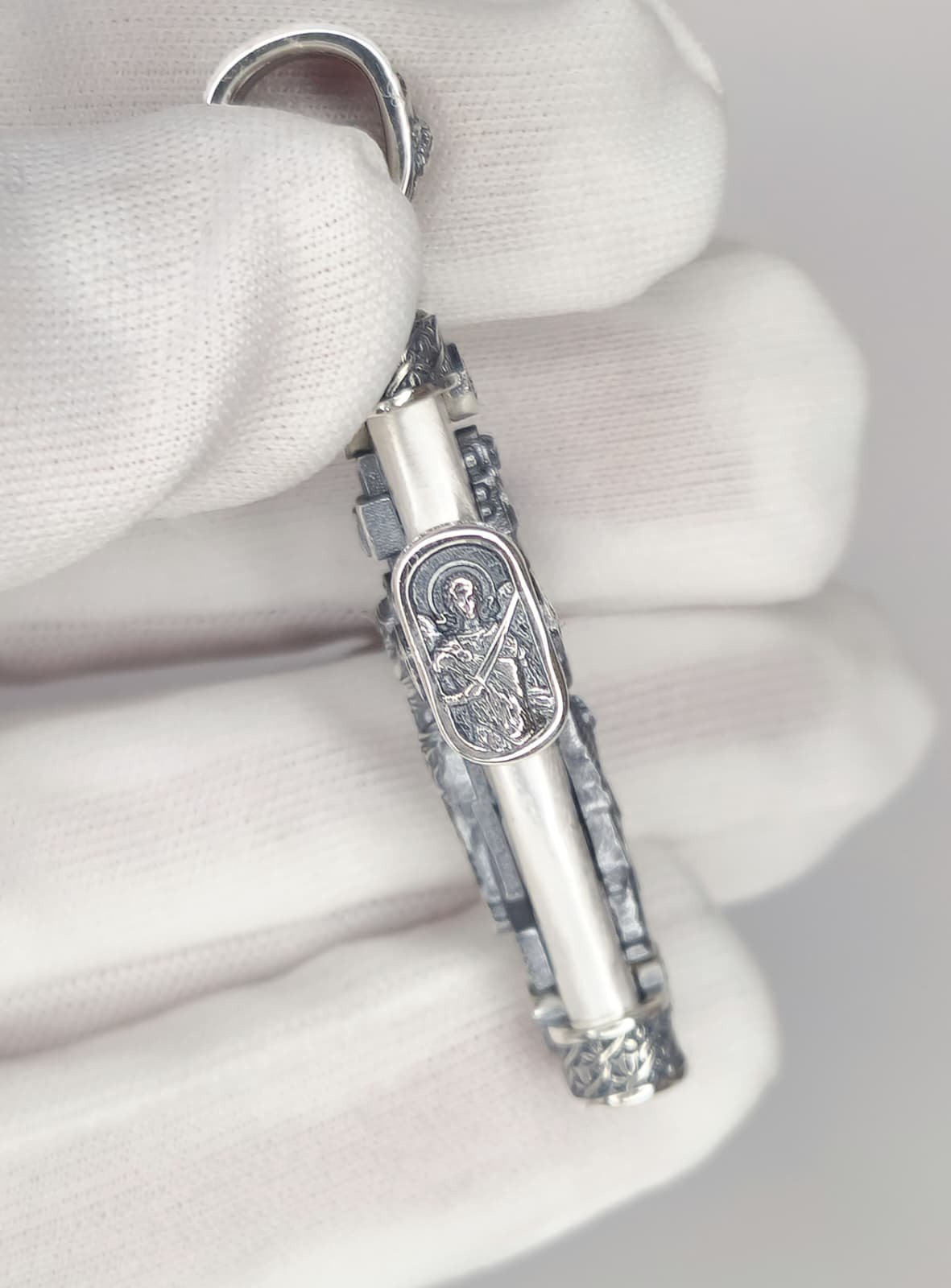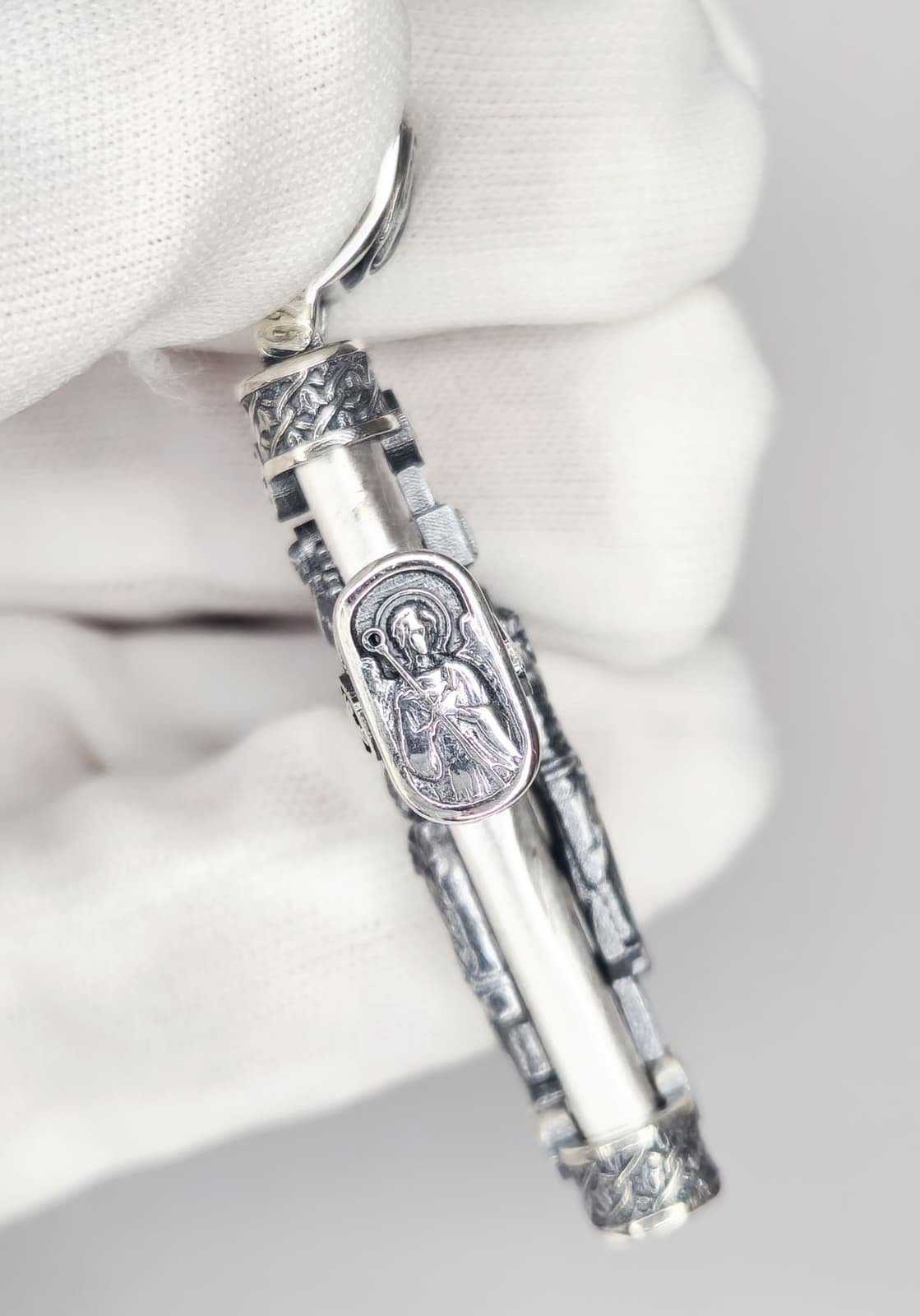 Išskirtinės kokybės 925 prabos sidabro kryželis, dekoruotas gilios reljefinės ikonografijos detalėmis. Kiekvienas kryželio elementas turi savo teologinę ir apsauginę reikšmę, todėl pakabukas tarnauja ne tik kaip papuošalas, bet ir kaip dvasinė apsauga.