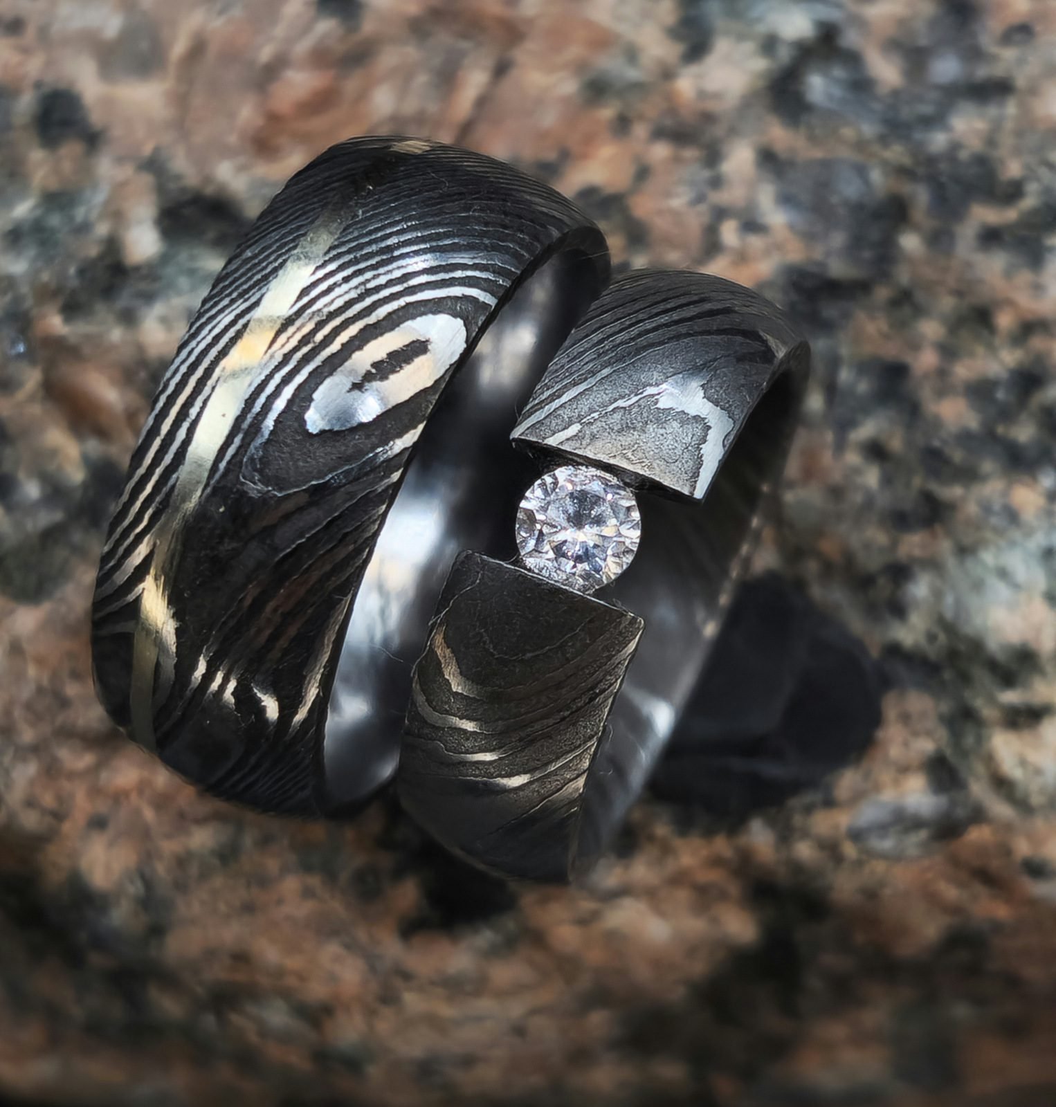 Unikalių žiedų komplektas pagamintas iš Damasko plieno ir juodintas patina. Šie žiedai tarnaus jums visą likusį gyvenimą, bei išskirs jus tarp aplinkinių. Damasko žiedus gaminame bet kokių jums norimų pločių bei dydžių.