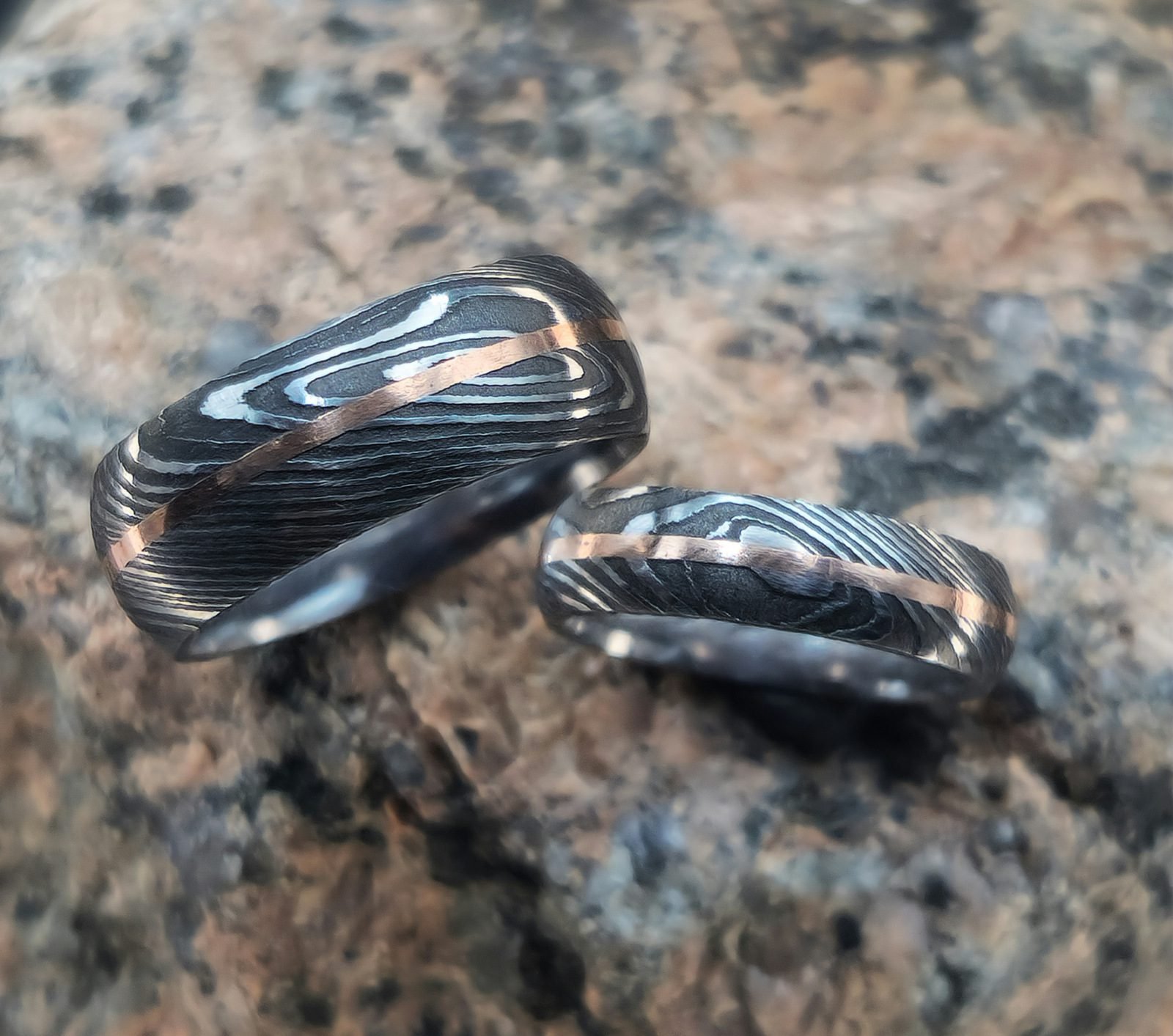Unikalių žiedų komplektas pagamintas iš Damasko plieno ir juodintas patina. Šie žiedai tarnaus jums visą likusį gyvenimą, bei išskirs jus tarp aplinkinių. Damasko žiedus gaminame bet kokių jums norimų pločių bei dydžių.