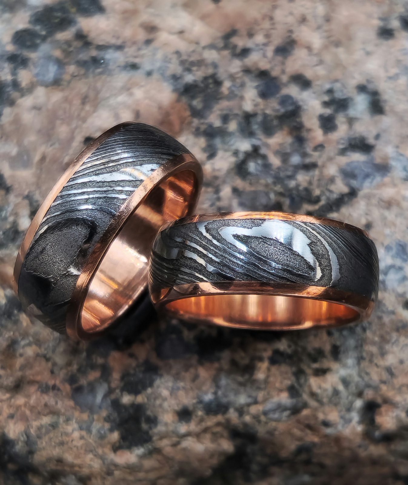 Unikalių žiedų komplektas pagamintas iš Damasko plieno ir juodintas patina. Šie žiedai tarnaus jums visą likusį gyvenimą, bei išskirs jus tarp aplinkinių. Damasko žiedus gaminame bet kokių jums norimų pločių bei dydžių.