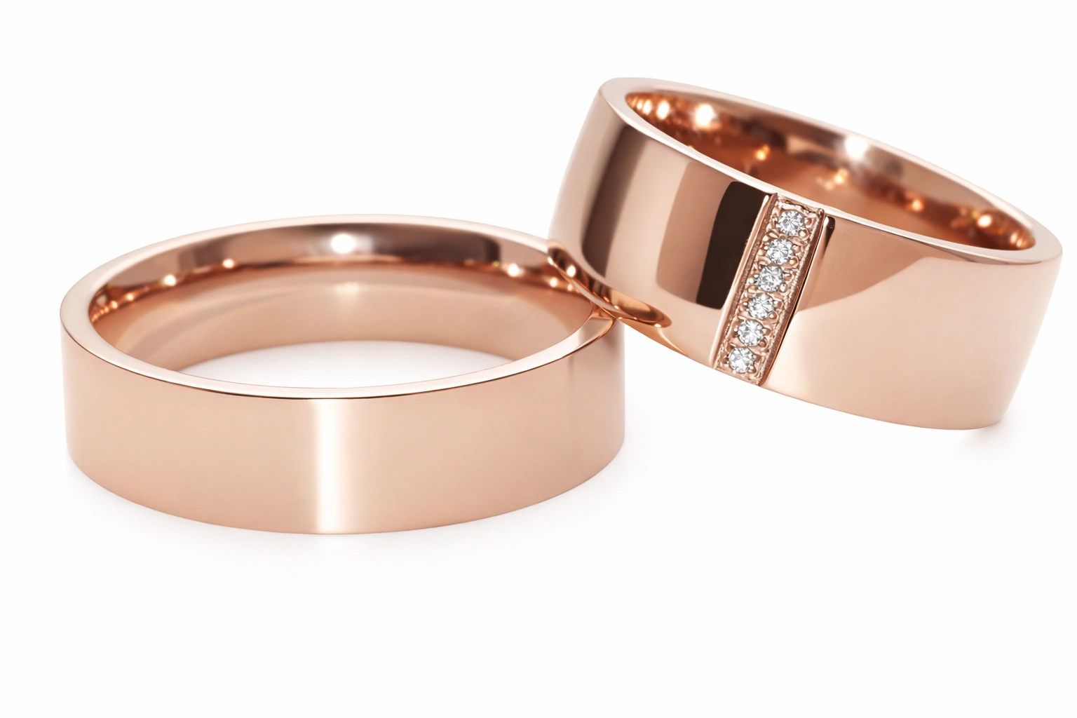 Žiedų išorė spindinti: viršutinė ir apatinė dalys – rausvo aukso spalvos, suteikia žiedams šilumos ir žavesio, o moteriškame žiede subtiliai įkomponuoti cirkonio dioksido akmenys, primenantys deimantus.
