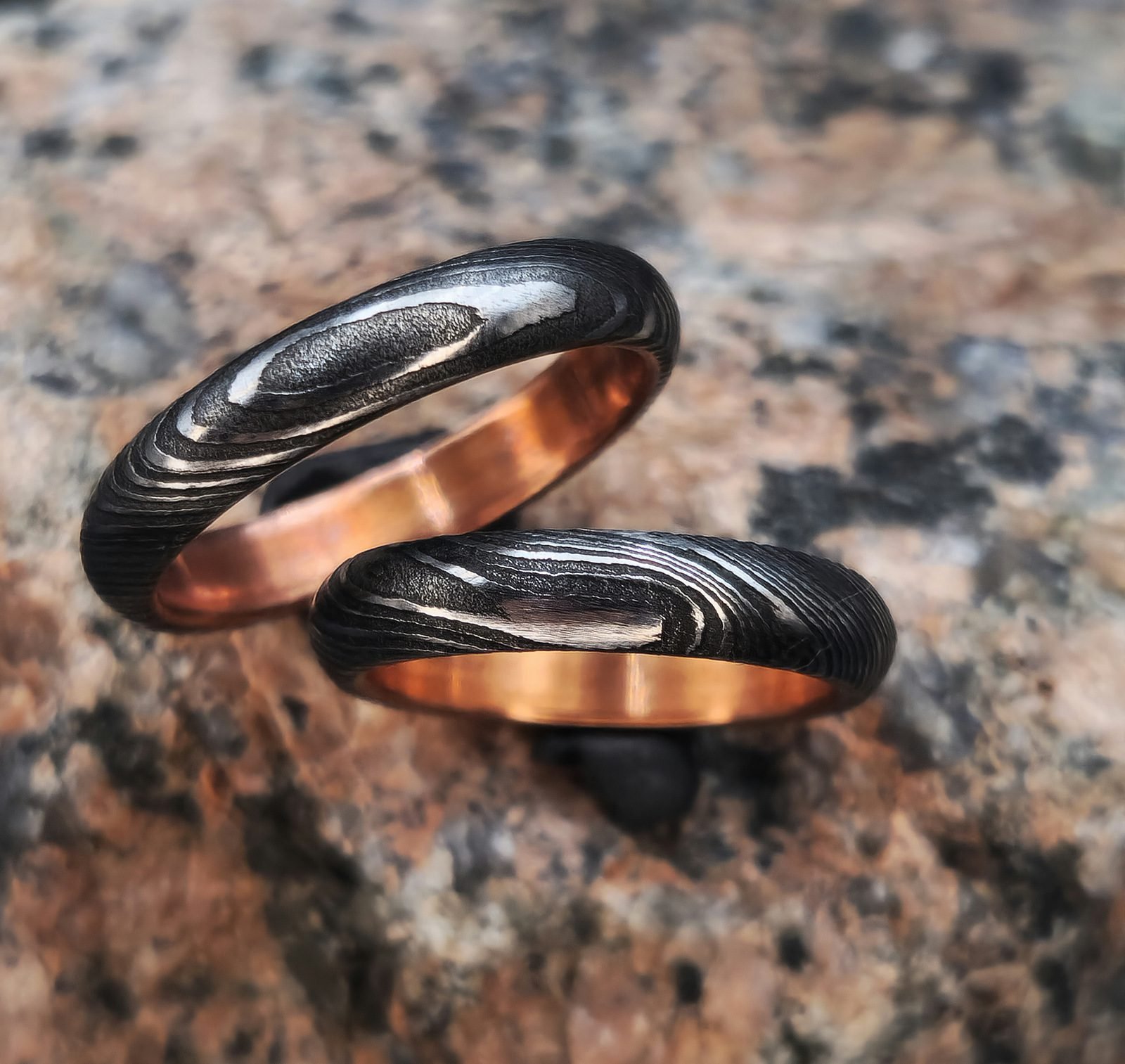 Unikalių žiedų komplektas pagamintas iš Damasko plieno ir juodintas patina. Šie žiedai tarnaus jums visą likusį gyvenimą, bei išskirs jus tarp aplinkinių. Damasko žiedus gaminame bet kokių jums norimų pločių bei dydžių.