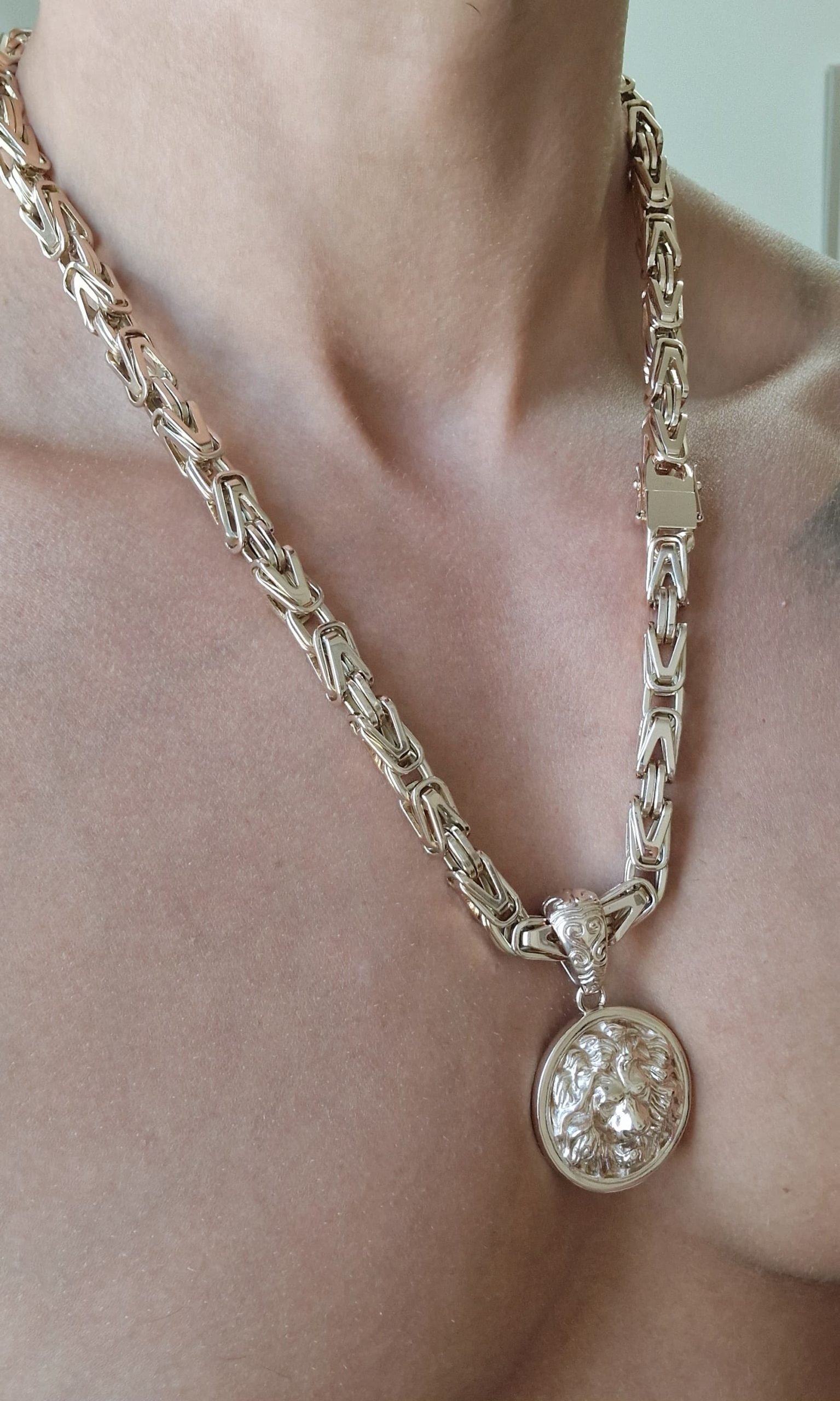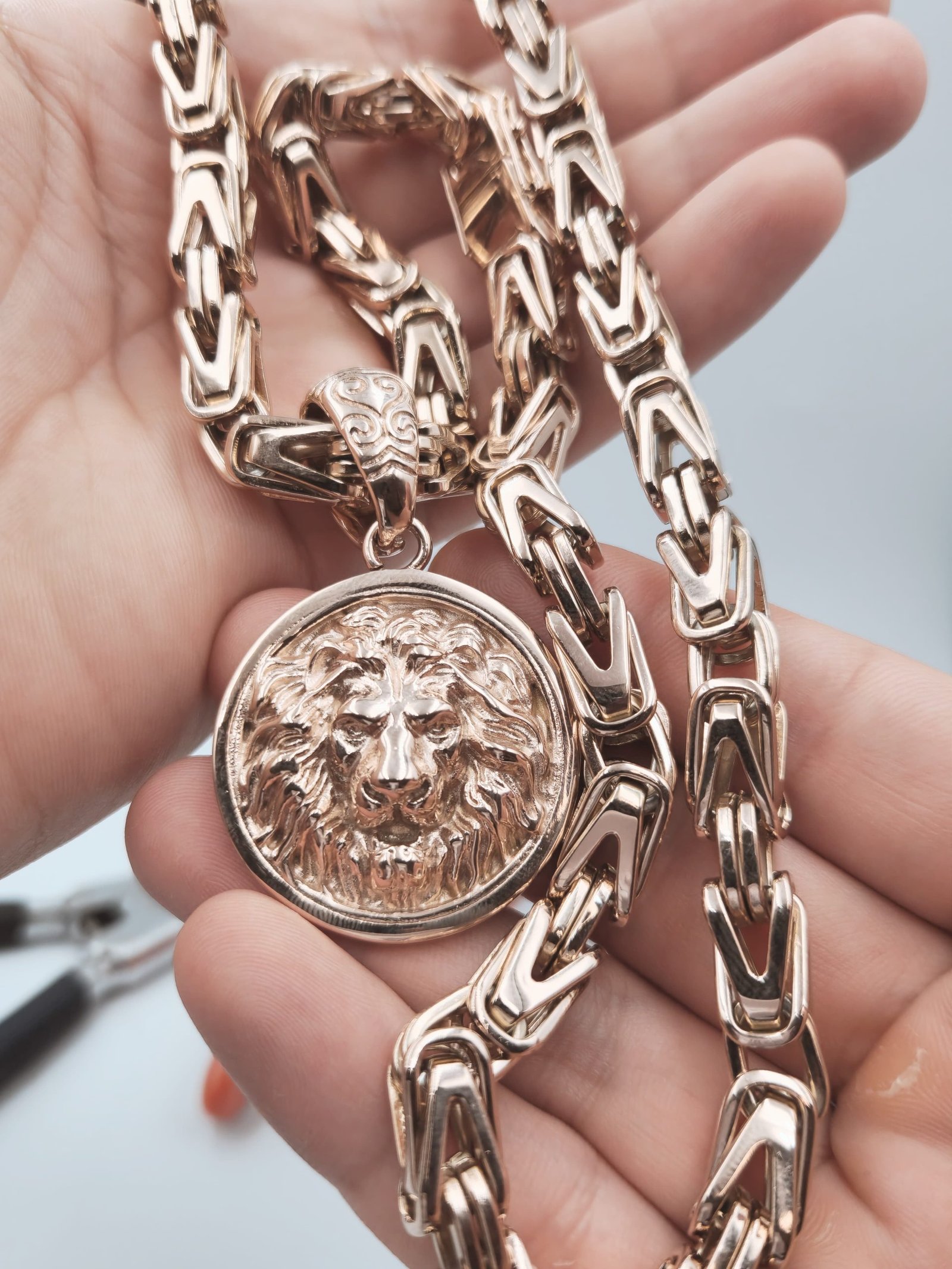 Grandinėlė Pitonas 8 mm ir Liūto amuletas pagaminti iš aukštos kokybės titano ir padengti 585 prabos rausvu auksu, naudojant galvaninį auksavimą su 5 mikronų storio sluoksniu. Toks dengimas užtikrina ilgaamžiškumą, atsparumą dėvėjimuisi ir spalvą, vizualiai identišką pilnai rausvam auksui.