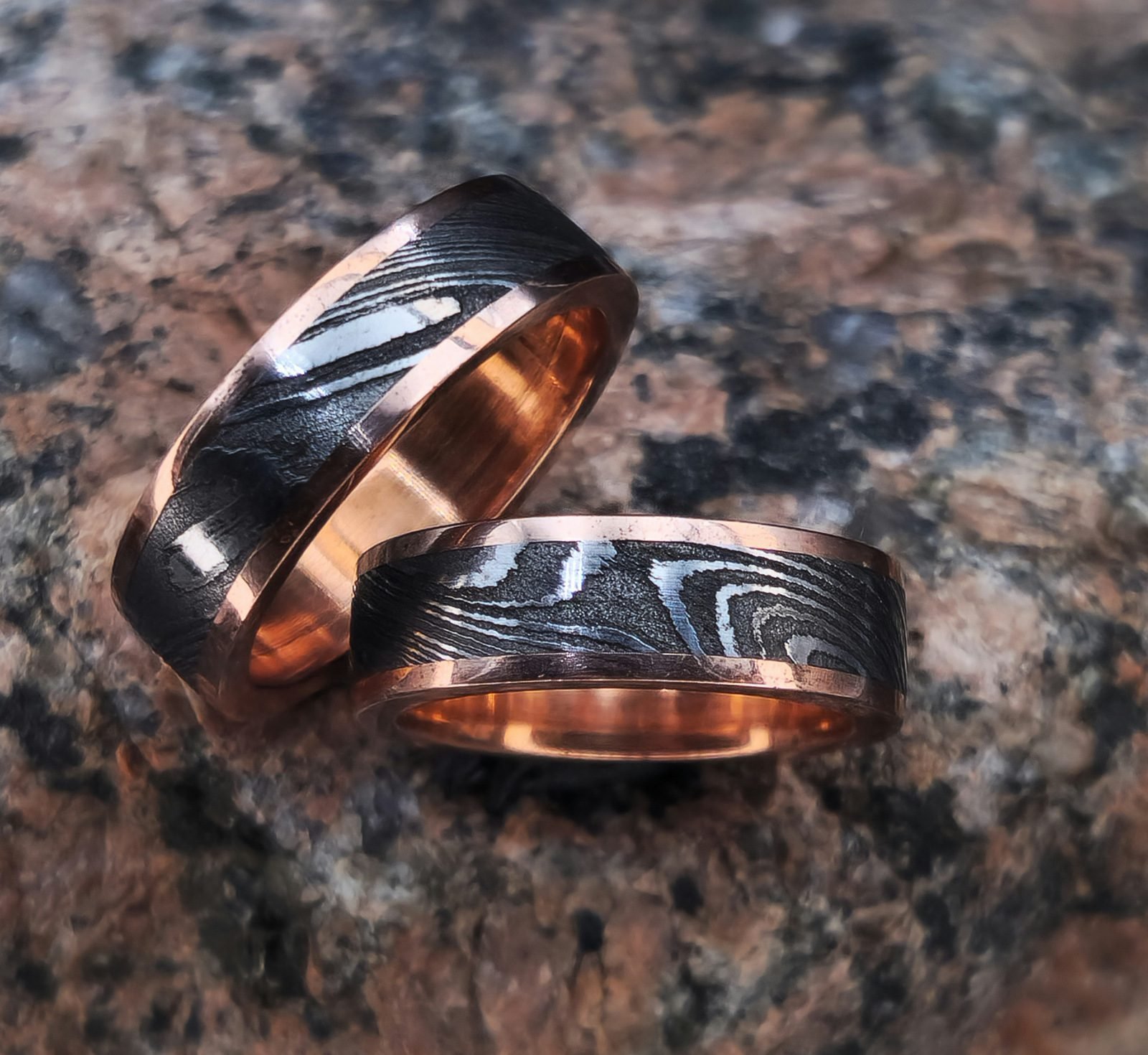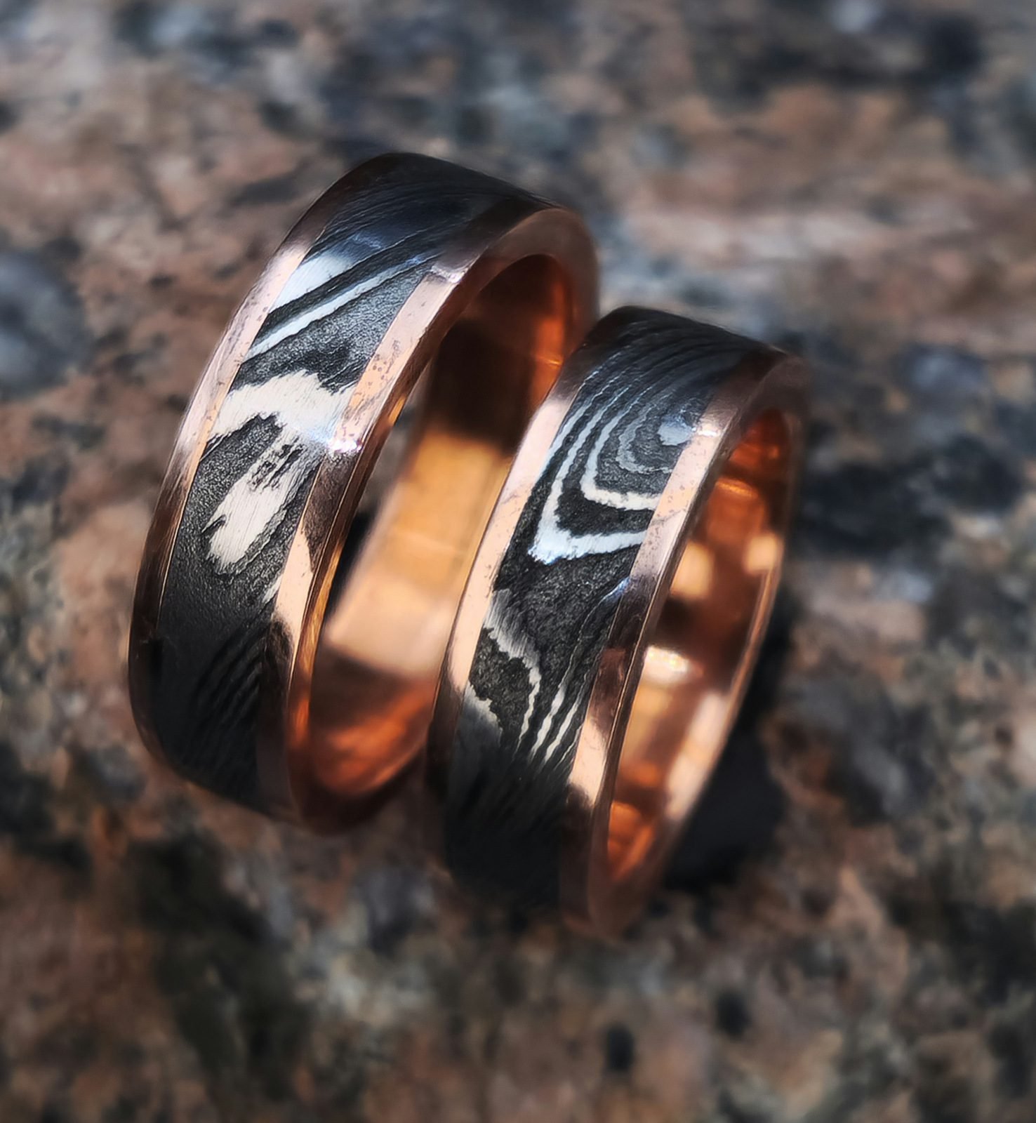 Unikalių žiedų komplektas pagamintas iš Damasko plieno ir juodintas patina. Šie žiedai tarnaus jums visą likusį gyvenimą, bei išskirs jus tarp aplinkinių. Damasko žiedus gaminame bet kokių jums norimų pločių bei dydžių.